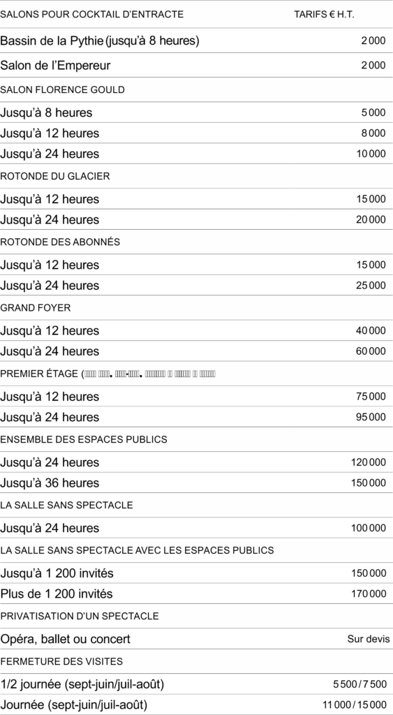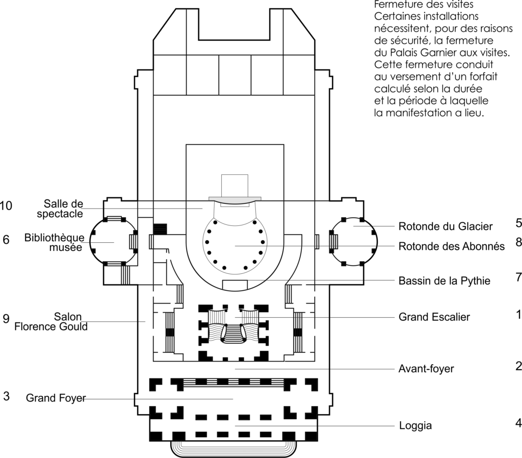 Fermeture des visites Certaines installations nécessitent, pour des raisons de sécurité, la fermeture du Palais Garnier aux visites. Cette fermeture conduit au versement d’un forfait calculé selon la durée et la période à laquelle la manifestation a lieu.